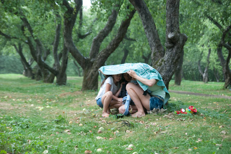 Ничто не предвещало грозу. Однако спустя час полил сильный ливень. Мы спрятались под деревом, Маша спала в Кирюшиной коляске.