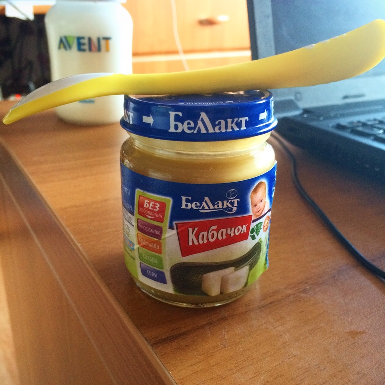 Мы тоже уже 3 дня кушаем кабачок! ) Макс первый раз не ахти, а вот сегодня уже с удовольствием плямкал. ) Я не по 1 ложечке даю, а по 6-7 за раз, но не полных, а так — типа запачканных. )))) Плюс оно ж еще и вытекает половина изо рта! ) Прикольно, у нас Беллакт только смеси есть, и то 2 вида. (