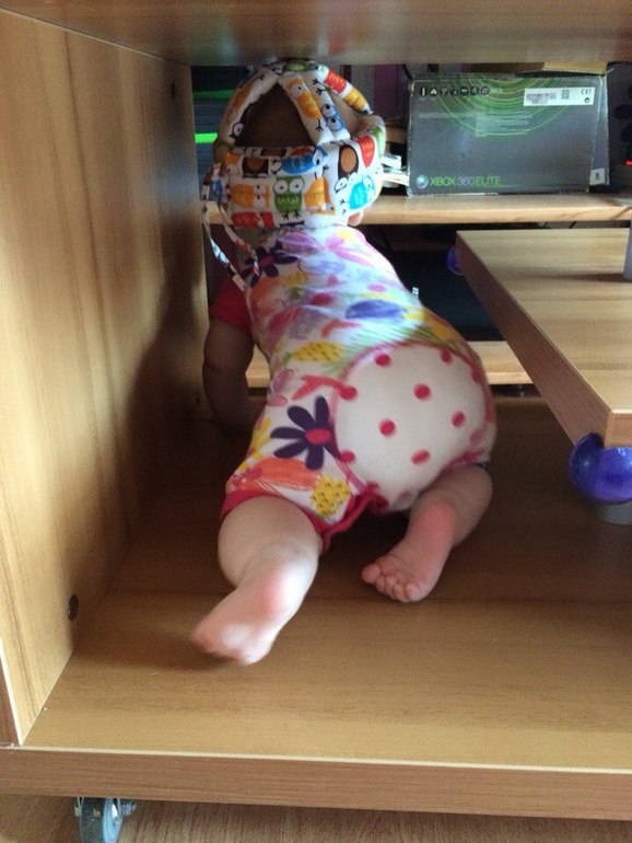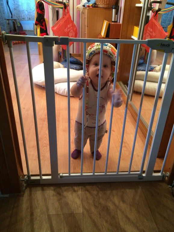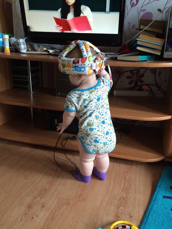 Размер шила в ребёнкиной жопе сравним примерно с Эйфелевой башней. Она везде, ей нужно всё, она хочет попасть всюду! После пары смачных падений и последующих истерик был куплен шлем, чтоб хоть немного уменьшить последствия падений. Ну и детские ворота тоже очень клёвая вещь, кстати - теперь ботинки в коридоре и кошачий туалет вне зоны доступа)