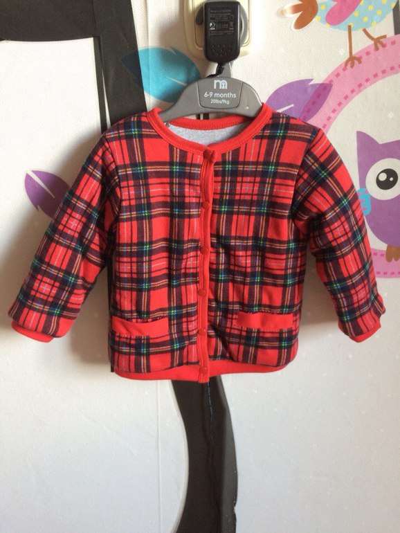 Сейчас пока что надеваю на улицу вот этот жакетик. Купила за смешнейшие копейки в детском магазине возле дома. В очередной раз убедилась, что на бирке может быть написано что угодно, а вещь всё равно лучше мерять - написано, что 86 размер, но Лесе он практически впору уже сейчас, рукава совсем немного длинноваты.