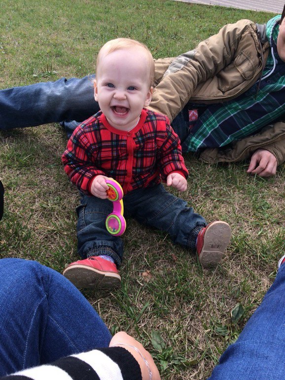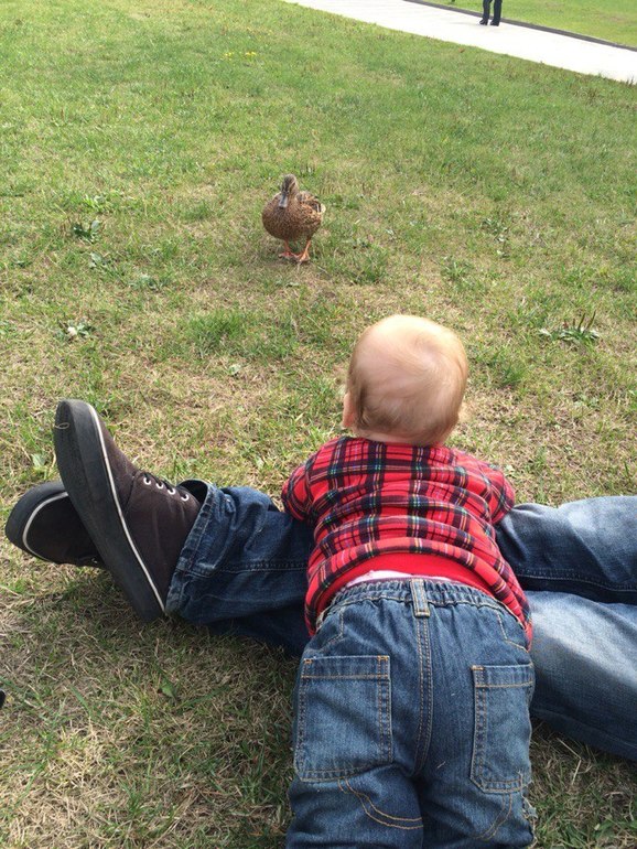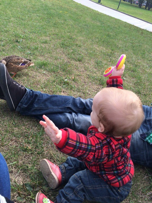 Показали ей уток. До этого не воспринимала вообще, сейчас хоть внимание обратила наконец. Пыталась подбить крылатую своей погремухой - не получилось