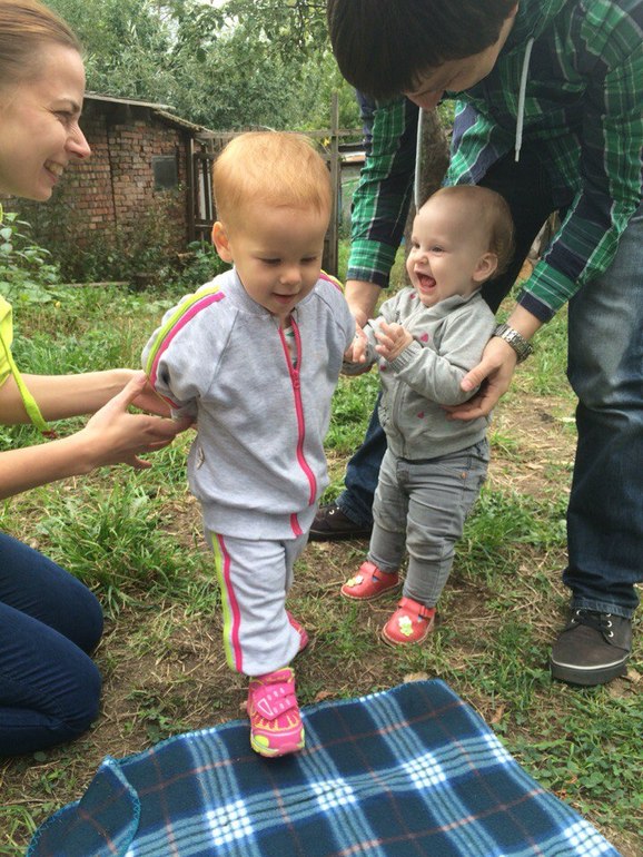 Вдоль дивана уже практически бегает) Без опоры всё ещё не хочет стоять, падает на жопу практически сразу же. За руки топает с переменным успехом, под настроение. Если звёзды встали удачно - может и за одну руку шагать вполне уверенно, если нет - и за две не будет, сразу же садится.