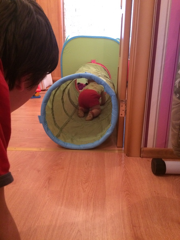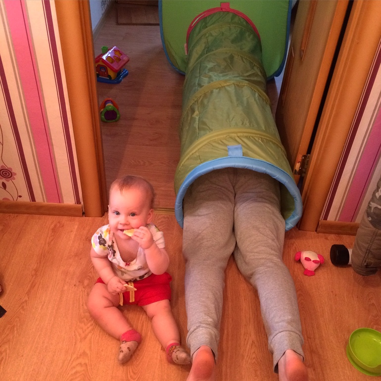 Очень сильно продвинулась вперёд в плане взаимодействия предметов между собой и игр с ними. Игрушки теперь не просто пожираются, Леся пытается с ними что-то делать. Хит месяца - сортер в виде домика. Как сортером она ещё не научилась им пользоваться, зато отлично прокачала скилл открывания крыши и засовывания внутрь предметов. Освоила юлу, складывает понемногу кубики. Завела себе нычку - прячет утащенные запретные предметы типа пульта или папиных часов в ящик под диваном. Если бы кто-то рассказал мне, что одиннадцатимесячный ребёнок на такое способен - ни за что не поверила бы, но факт остаётся фактом) Полюбила тоннель и палатку икеевскую, может шариться там целыми днями.
