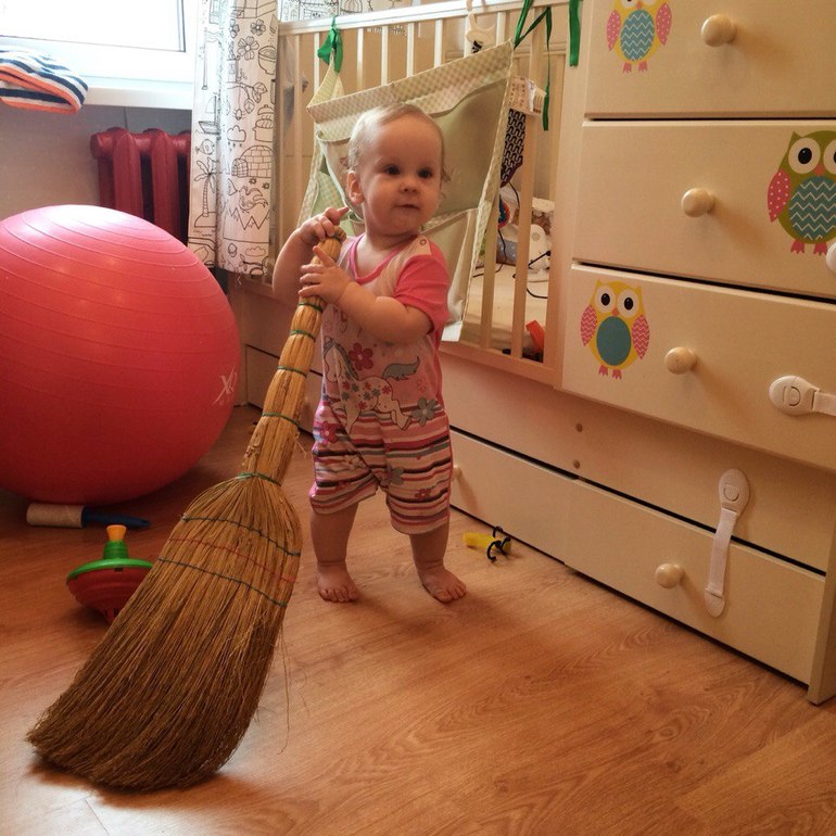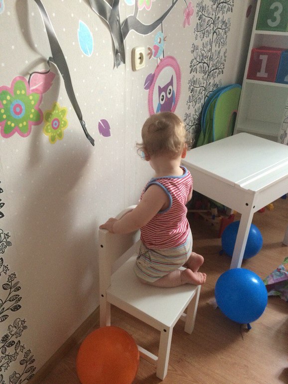 За этот месяц даже не начавшая ещё толком ходить Леся начала сразу же бегать, чем доводит меня до припадков. Ноги-то ещё не держат толком, да и координация подкачала, поэтому все углы - её, и лоб с коленками у ребёнка перманентно синие. Буквально на днях озадачила меня ещё одним "чудесным" умением - начала залазить на свой стульчик и дербанить наклейки на стенах в своей комнате. Снизу уже коты всё сожрали, сверху вон она теперь добавляет) Всё бы ничего, если б она ещё и слазить с него научилась. А то залазит, ковыряет что ей надо, а потом орёт, пока не снимут)