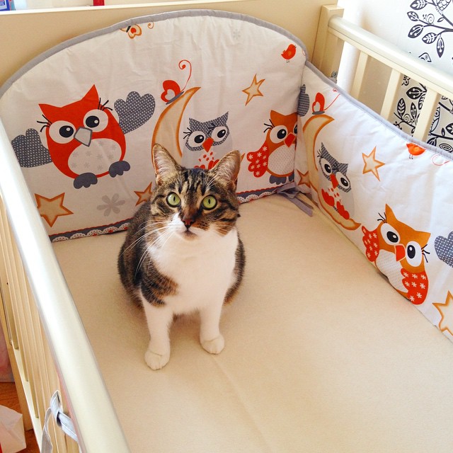 Ещё на днях примеряла постельное к кроватке, чтоб не оказалось, что что-то к чему-то не подходит, не тот размер и вообще. С креплением бортиков, конечно, получается не очень - нужно было другие смотреть, с учётом того, что купили трансформер. Но благодаря кривости конструкции и чудеснейшим щелям Гандыляна в не совсем предназначенных местах, всё прицепилось как влитое. Кошь моментально оценила и одобрила обновки. Кажется я знаю, кто будет вместо меня по ночам караулить наследницу)
