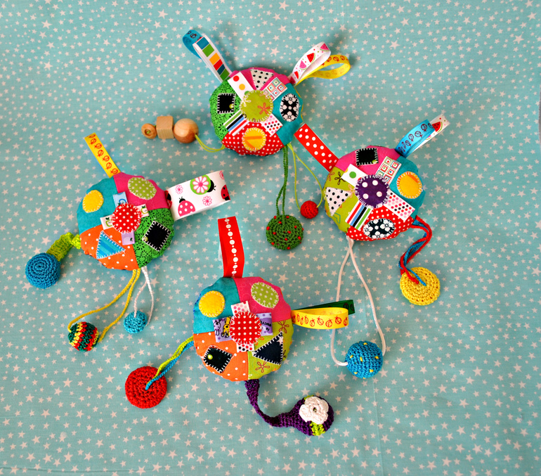 И сшила немного погремушек - трепалок с разными подвесками и пищалкой и гремелками. Продаются здесь: