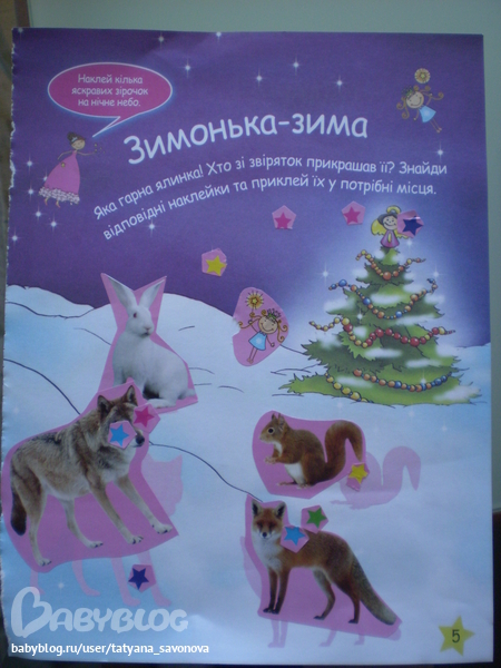 Спрашиваю у неё, где у нас ёлочка стояла? Показывает правильно! Я думала, что у таких маленьких детей память короткая))) Потом разбирались со зверушками. Сначала рассмотрели зверят, потом показала мне места куда клеять, а мне оставалось отрывать наклейки и предоставить ей полную свободу действий ))) Места нашла сама, прада, почему-то волку залепила глаза звёздочками????? Лисе, видимо тоже пыталась. Почему???