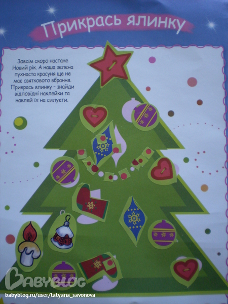С начала книжку просмотрели вместе, а потом начали наряжать ёлочку. Отрывать наклейки дочке, почему-то не понравилось, - отрывала я и давала ей. Один шарик показала, как нужно клеять, другие она сама находила подходящее место и приклеивала!