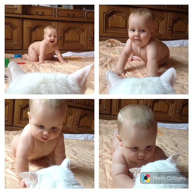 Юный охотник! Интерес к Матильде становится сильнее с каждым днем, по мере возможности добраться до нее)) #киса #кошка #малыш #мило #охотник #ползунок #белаякошка #матильда #коллаж #дети
