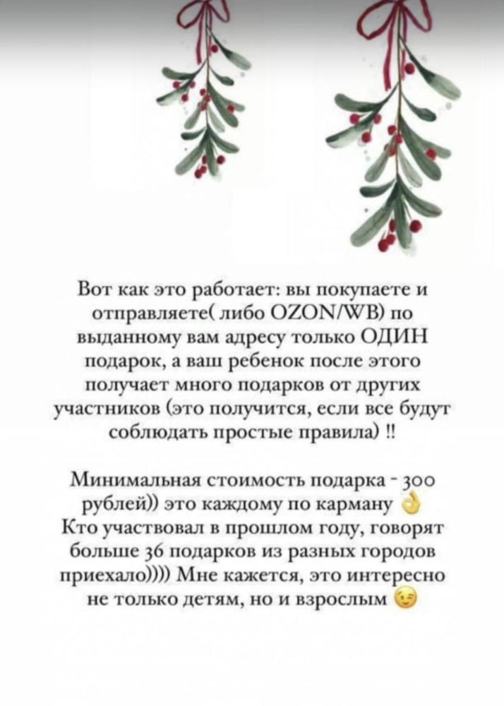 Ириска, я в том году участвовала тоже первый раз и моя дочь получила 11 подарков. И сам интерес был не в том что она получила, а в том откуда этот подарок пришел. Только в том году было не через маркетплейсы, а через почту России.