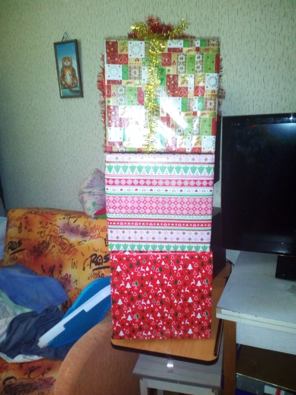Вот 3 мои коробки которые я уже обмотала в оберточную бумагу.Осталось все до ума довести,стоят спрятанные и наполненные.