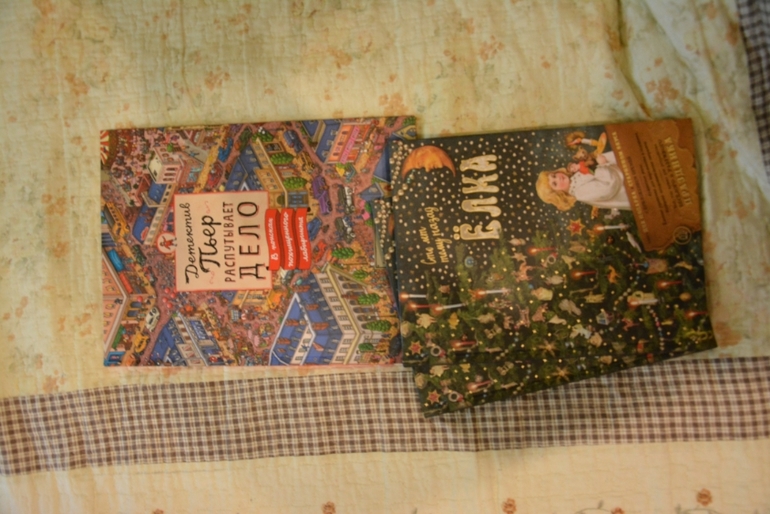 2.Детектив Пьер распутывает дело.Книга крута,огромна просто.Книга игра,гляделки .Купила пока старшей+еще одну купила и подарила,Внизу 2 книги Елка 100 лет тому назад(все развороты можно увидеть в лабиринте)Книга уникальная ,про то какими елки были раньше,как украшали,старинные вырезки газет и много фактов,рассказов и стихи.Это изд-во Лабиринт ,хит прошлого года.Сейчас выпустили аналог,улучшенный,больше инфы,игр,и тд.Многое совпадает с моей+много нового.Ёлка. Новейшее издание для подарка в стихах и прозе. Но и стоит она во много раз дороже.Поэтому обошлись мы тем что на фото(тем более 1 день остался скидки 45 % на нее вообще за даром)Так вот одна Ане и остальным,вторая уехала на подарок.
