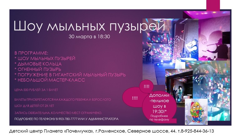 Бронь билетов по т.8-903-780-7777. Выкуп в детском центре ПОЧЕМУЧКА (Раменское, Северное шоссе, 44)