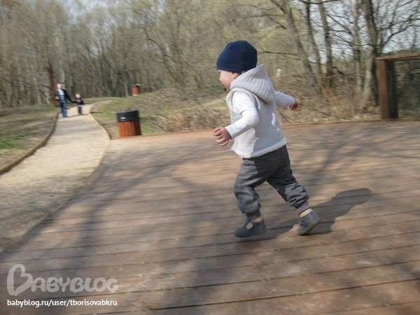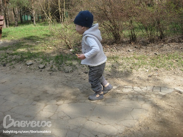 Очутились с Илюшкой на дорожке, посыпанной мелкими камушками, которые очень заманчиво шуршали под ногами. Отрезок в 50 метров, прошли минут за 20. Ребенок с удовольствием бегал, присаживался, ковырялся в этих камушках. Оказалось, что там очень много интересного! Особо заманчивые предметы складывались в коляску. После чего там оказалось: камушек, веточка, палочка, листочек, лепесточек, два вида почек, шишечка, веточка с листочками и кое-то повторялось в разных вариациях :) Надо было видеть с каким любопытсвом, старанием и я даже сказала бы с нежностью, Илюша складывал свои находки!