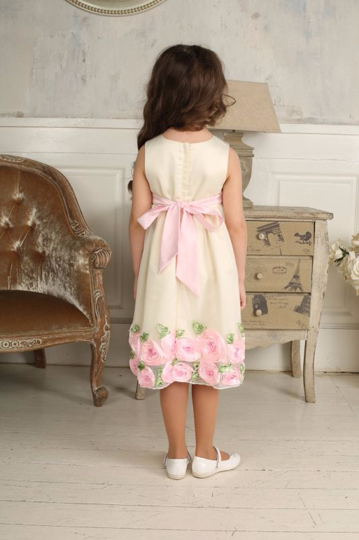 Нарядное платье из атласа покрытое сеткой. По низу платья нашиты атласные ленты в виде цветов. На полочке нашита розочка из атласной ленты. Пояс нежно розового цвета завязывается сзади на бант. Застежка молния по спинке.