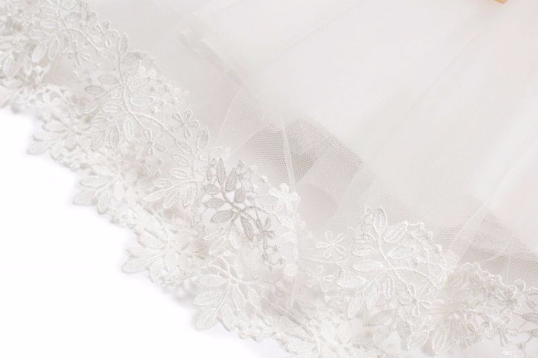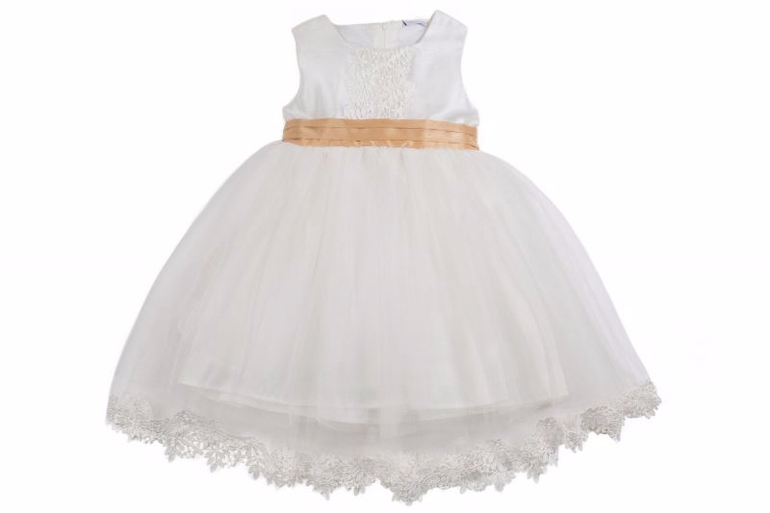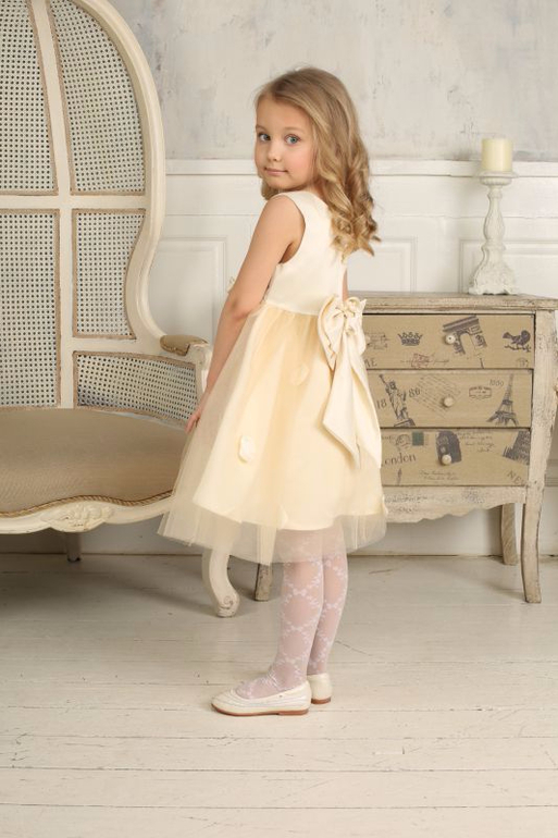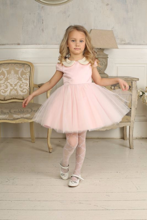 Нарядное воздушное платье для маленьких принцесс. Верх платья покрыт нежным кружевом. Юбка выполнена в виде пачки из многослойной сетки, по низу юбка украшена кружевом нежно-персикового цвета. Платье застегивается на молнию на спинке. Сзади платье украшено красивым кружевным бантом. Бант съемный.
