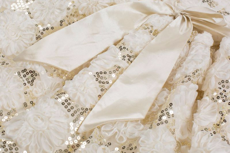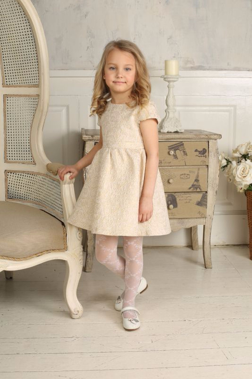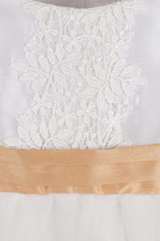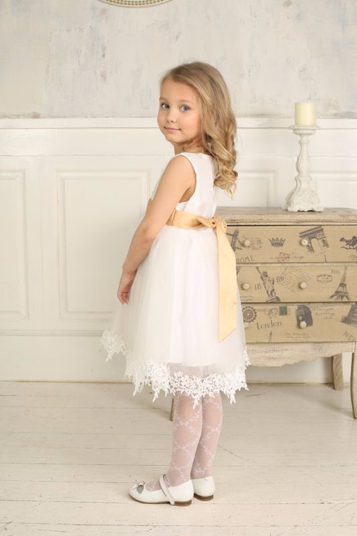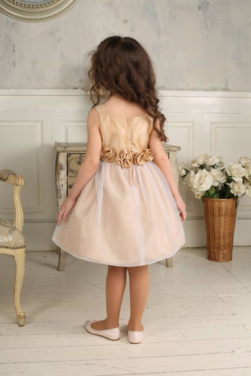 Нарядное платье из фактурной сетки. Сетка расшита лентами в виде цветов и золотистыми пайетками. Пояс из тафты завязывается сзади на бант. Платье на молнии сзади.