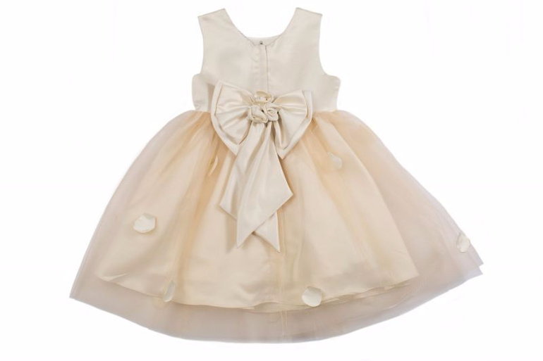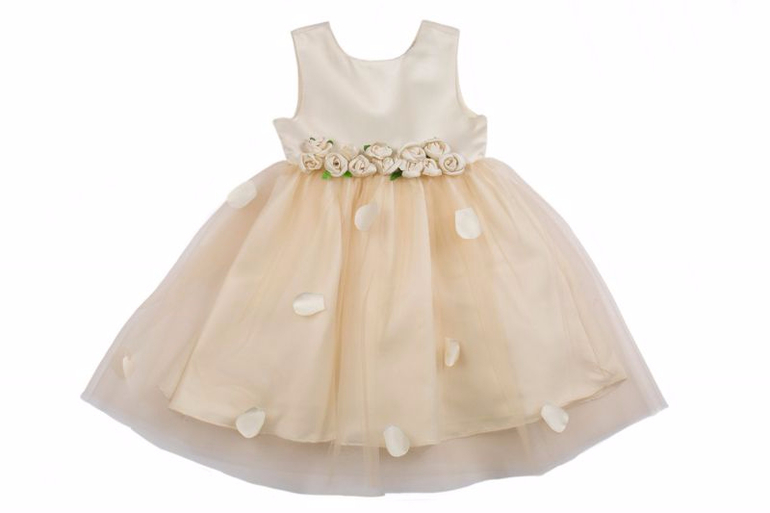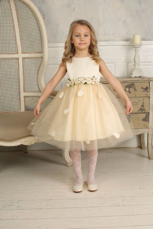 Нарядное комбинированное платье. Верх платье и нижняя юбка из атласа. Верхняя юбка собрана из сетки. Спереди на поясе декор из цветов, лепестки разбросаны по верхней юбки платья. Пояс завязывается на спинке в объемный бант.Платье застегивается на молнию на спинке.