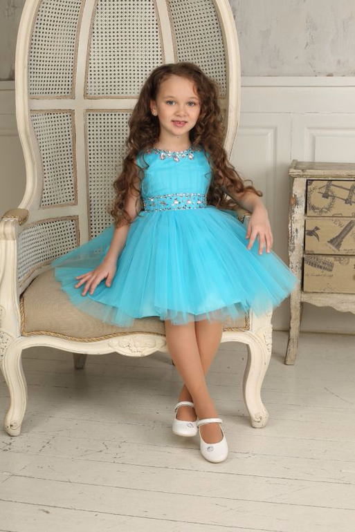 Нарядное воздушное платье. Верх платья из сетки, нижняя часть - тафта,. Юбка выполнена в виде пачки из тафты и многослойной сетки. Лиф спереди расшит стразами, сзади завязывается на бант. Платье застегивается на молнию на спинке.