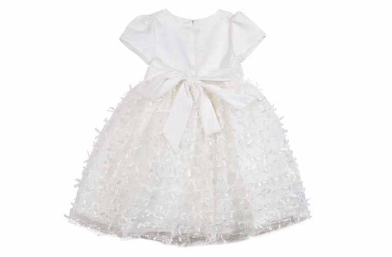 Нарядное воздушное платье. Верх платья и рукава выполнены из атласа,. Юбка объемная многослойная из атласа и фактурной сетки, на которую настрочены маленькие атласные бантики. Пояс сзади завязывается на бант. Платье застегивается на молнию на спинке.