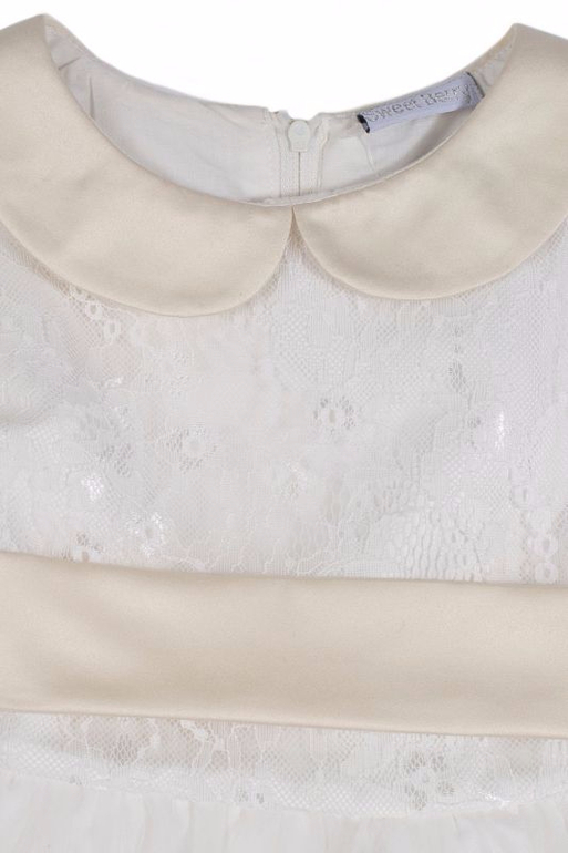 Нарядное платье из комбинированной ткани. Лиф и нижняя часть юбки из атласа. Лиф дополнен кружевом. Рукава-крылышки присборенные у основания, воротничок и пояс выполнены из атласа молочного оттенка. Юбка собрана в пышную сборку. Воротничок расшит вручную жемчугом. Платье застегивается на молнию на спинке.