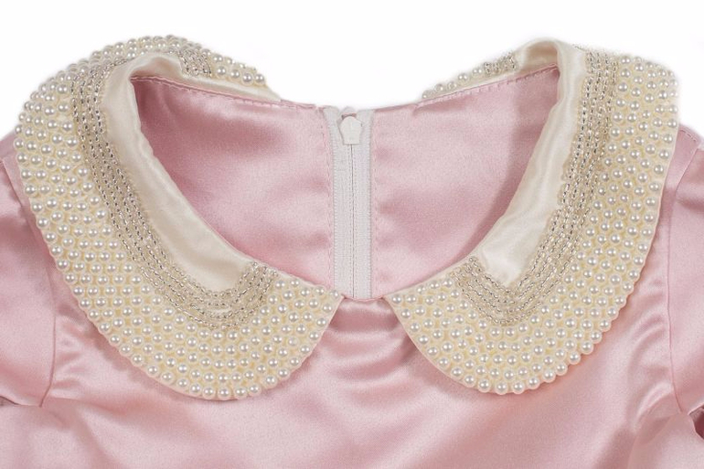 Нарядное платье из комбинированной ткани. Верх и рукава из атласа. Юбка выполнена в виде пачки из многослойной сетки. Воротничок расшит вручную жемчугом.