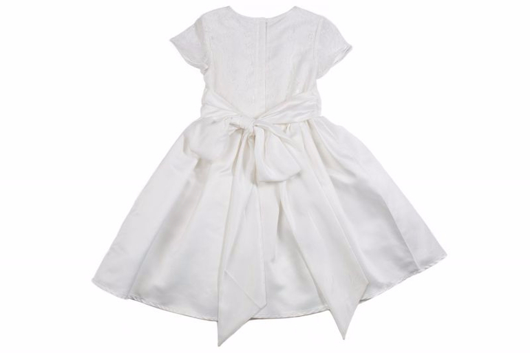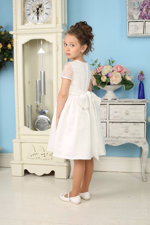 Состав:Нарядное платье из атласа, лиф покрыт ажурной сеткой, платье имеет застежку - молнию на спинке. Пояс завязывается на спинке в объемный бант.
