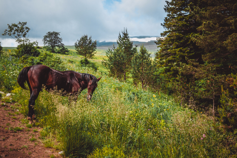 Спустились мы на приют, коней расседлали, привязали и захотели посмотреть закат. А нам с Нинкой один коневод и говорит: "Вы далеко не ходите, у нас тут медведь есть, сейчас осень, он перед зимой отъедается, бродит везде где попало. Если куда хотите пойти, нам обязательно сообщите." Мы головами своими дурными покивали и пошли восвояси. А то мы не слышали 100500 разных приколов про медведей! Нашли кого пугать детскими страшилками!