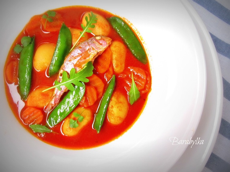 Ничего сложного в приготовлении нет. Сделать надрезы на рыбе, приправить солью. Далее я обжарила крупно нарезанный лук, чеснок и имбирь и нафаршировала этой ароматной начинкой рыбу. Затем отправила запекаться в разогретую духовку на 25 минут при темп 190 гр. Для гарнира карамелизировала сладкий перец и лук-шалот.