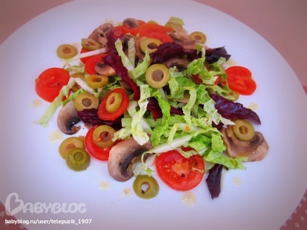Как вариант добавляют огурцы, оливки, чеснок, моцареллу.