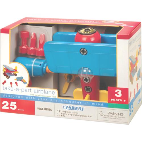 В набор входит: игрушка-конструктор, шуруповёрт на батарейках с 3 насадками. Самолёт разбирается на 21 деталь . Батарейки в комплект не входят.
