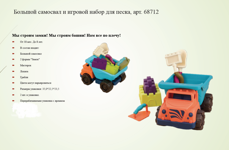 B Dot - это семейный бизнес, основанный в Монреале (Канада) и Платтсбурге (Нью-Йорк). На протяжении 100 лет компания занималась изготовлением продукции, предназначенной для семьи. Благодаря инновационному мышлению, уникальному дизайну и неизменной приверженности к безопасности и надежности, B Dot создал игрушки, пользующиеся популярностью во всем мире. И только совсем недавно игрушки B Dot появились на российском рынке товаров для детей. Все игрушки проходят строгие процедуры тестирования, которые подтверждают их безопасность. Игрушки B Dot не содержат свинца и фтолаты