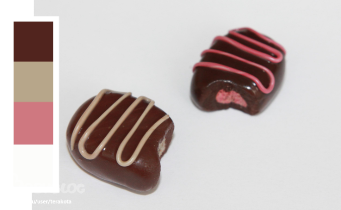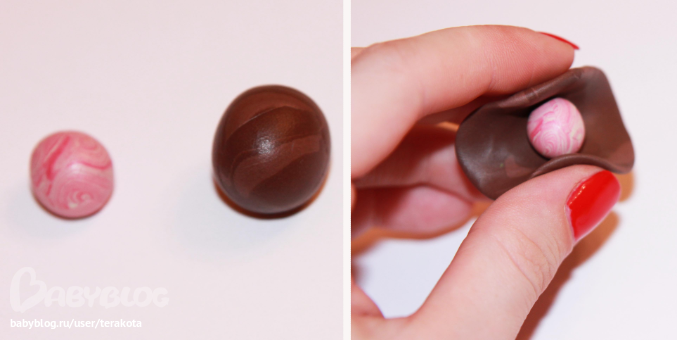 Скатываете два шарика, розовый поменьше для начинки, шоколадный побольше.