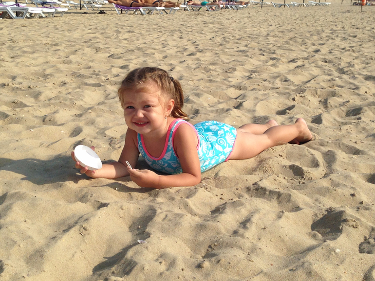 Пляж чистый, море цветет)))) Но моим детях море и не нужно)))) В первый день я думала Стефания сьест весь песок на пляже))) Что она только не делала....бегала, прыгала. кувыркалась, утыкалась лбом, каталась по всему пляжу колбасой)))))Она была всяяяя в песке...я устала ее умывать))))