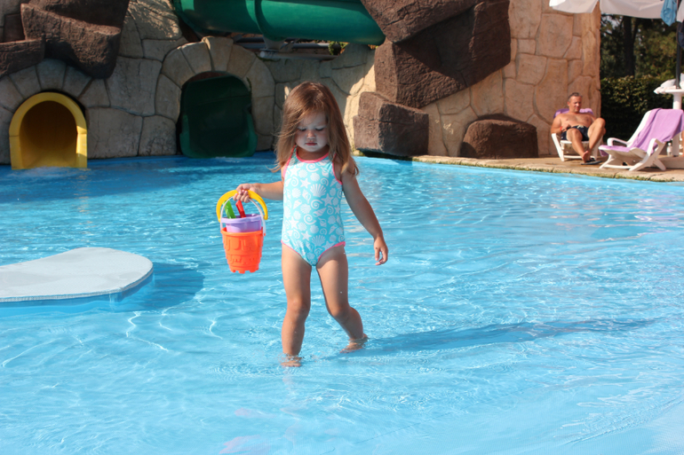 Дианка вообще да, при наличие бассейна, его выбирает. В этот раз "благодаря" холодной воде в бассейне распробовала море в полной мере. Но и до этого была не против прокатиться на небольших волнах