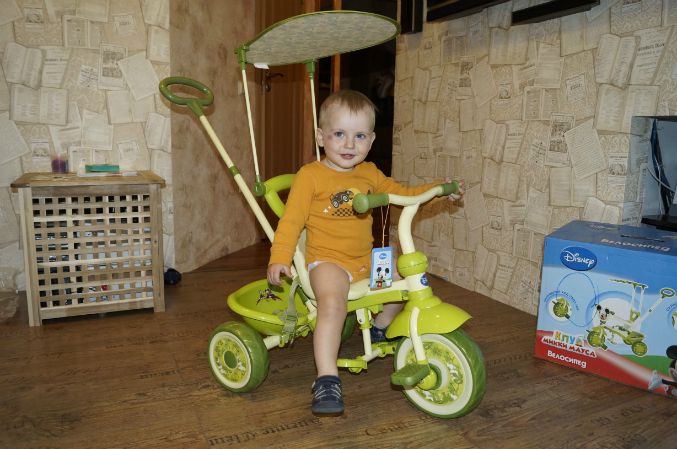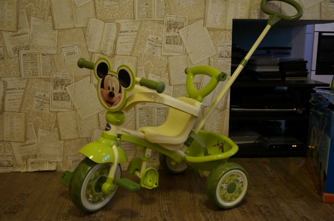 Сегодня наш велик приехал! Муж собрал его минут за 10,помимо инструкции даже 2 ключа в комплекте было)) Качество на высоте,рама металл,а остальное пластик,но ооочень приочень качественный,я к качеству очень придирчива,хочется всегда самого лучшего,тут придраться совершенно не к чему,колеса как у коляски типа пенорезины,не гремят,ручки резиновые,мордочку Микки Мауса легко можно снять,все гаджеты по ненадобности снимаются,педали могут блокироваться и не крутиться,завтра пойдем кататься на улице,я довольна,еще я очень довольна цветом,такой он летний,сочный,вкусный)) когда покупала на сайте еще был розовый,ниже фотки: