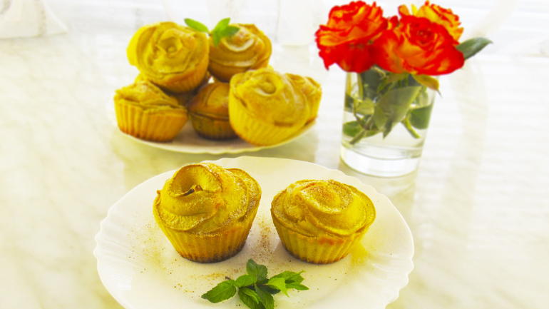 4.В подготовленные формочки для кексов распределяем тесто по 1.5 столовых ложки, и теперь в тесто помещаем бланшированные яблочные ломтики в форме розочек, или так как вам больше нравиться.