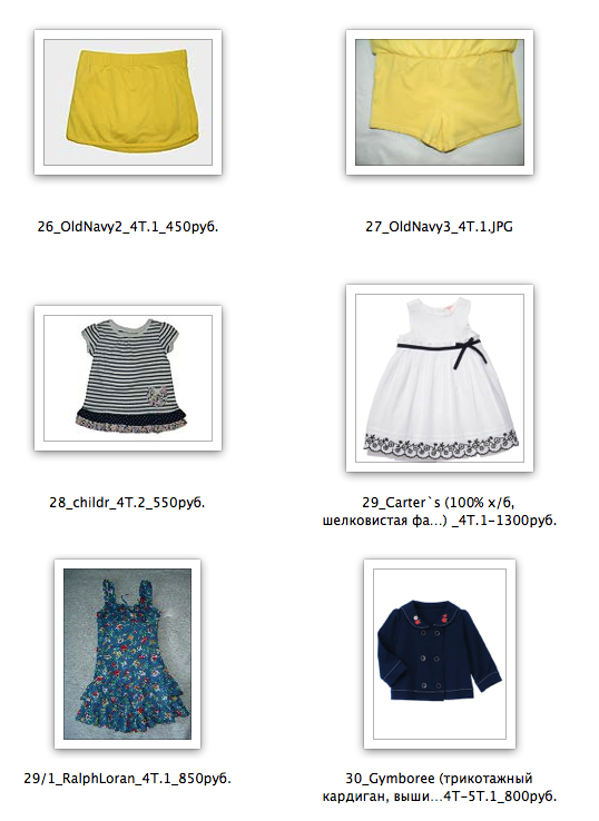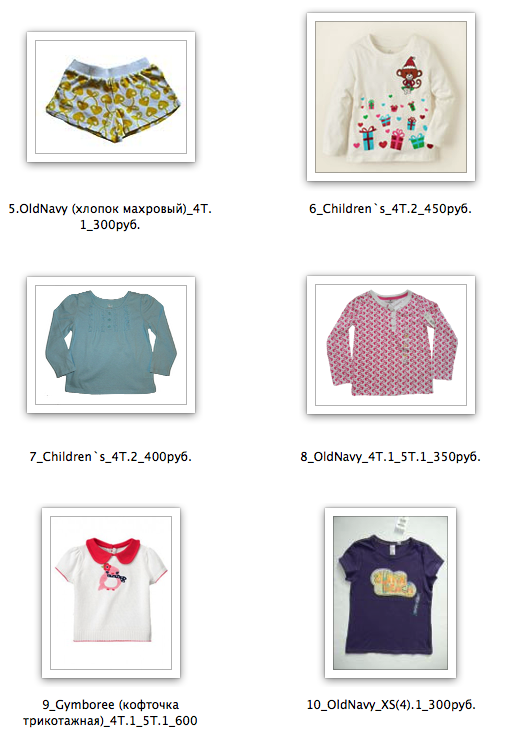 Обновленный заказ:)2 (футболка-собачка 4Т) — 400 руб.9 (кофточка трикотажная Снегирь 4Т) — 600 руб.12 (топ через шею черный XS(4) ) — 30014+15 (курточка х/б + шортики 4Т) — 600 руб. 16 (лосины т-синие 4Т) — 350 руб.18 (брюки хаки 4Т) — 500 руб.19 (брючки с бабочками 4Т) — 500 руб. 19/1 (брючки с ремнем-клетка 4Т) — 500 руб.29 (платье белое с вышивкой 4Т) — 1300 руб.29/1 (сарафан 4Т) — 850 руб.25 (юбка-тенниска 4Т) — 350 руб.30 (жакет синий 4Т) — 800 руб.Жилетка теплая черная XS(4) — 1000 руб.Купальник с якорями (№1 — 4Т) — 600 руб.Общая сумма: 8650 руб.