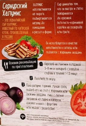 Ах да, сказать вам по секрету, как я употребила тот самый достославный Халумис?? Ни за что не догадаетесь... В этот раз я делала... пиццу))) И купленной по моему парт.заданию сыном Моцареллы для пиццы оказалось мало. На дворе - позднятина. Куды бечь?? В ночные супермаркеты? В лом, да и некогда. Открываю холодильник, медитирую над его содержимым... И тут глаз выхватывает ласково глядящий на меня Халууумис (ох ты мой родимый, тебя-то мне и надо!), ура! Если он подошел для хачапури, неужели не подойдет для пиццы? Да и вообще я - девушка, открытая для экспериментов всяческих кроме сексуальных извращений и расширителей сознания, так что решение было принято в доли секунды. Что могу сказать - смело и щедро сдабривайте свою пиццу Сернурским (кипрский Вам все равно сейчас не купить;) ) халумисом и имейте свой гастрономический кайф:) Ну и, если без шуток, он реально мало уступает по вкусу оригиналу. Конечно, за давностью лет не ручаюсь за мельчайшие нюансы и оттенки вкуса, но по большому счету - очень достойно. Между прочим, сын отчинил себе кусочек до того, как халумис пошел в пиццу, и я присоединилась к дегустации. Уверяю Вас, если решите сточить его вот так, в первозданном виде и состоянии, безо всяких там кулинарных манипуляций, не пожалеете ни разу, зуб даю! Там, кстати, на обороте еще шпаргалочки с рецептами для полного сервиса:)