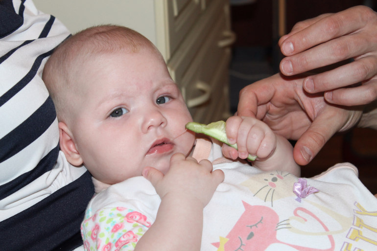 В понедельник дали малышке огурец, очень он ей понравился, еле отняли