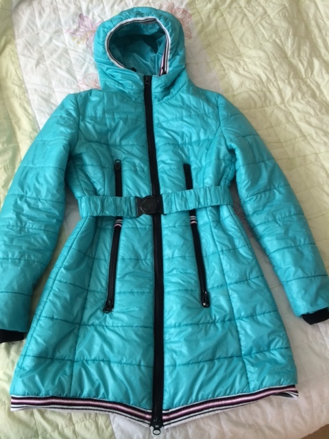 Размер 48. Утеплитель холкон - плотность 250, пояс в комплекте, капюшон и низ изделия обработаны трикотажной тесьмой. До середины бедра на рост 170