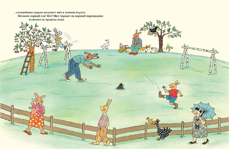 В воскресенье после обеда зайчонок Карлхен вместе с папой играют в футбол на лужайке за бабушкиным домом. Постепенно к ним присоединяются дядя Вилли и тётя Габи, кузина Кэти, близнецы Фридрих и Вильгельм и даже сама бабушка. Игроки показывают высший класс, а мама-судья строго следит за тем, чтобы они соблюдали правила. Напряжённый матч заканчивается победой обеих команд, после чего все отправляются пить какао с тортом!