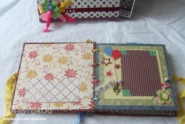 скрапбукингСделался у меня альбомчик про день рождение, размер 20*20, в мягкой текстильной обложке и с подарочной коробкой