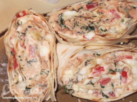 Покупаете лаваш (я складываю его в 2 листа, но это необязательно), промазываете его майонезом, оставляя место по краям, потом выкладываете консервированную пассированную горбушу, далее укроп мелко порезанный, помидорчик и яйцо. Всё слоями и заворачиваете. 2 часа в холодильнике и усё))))
