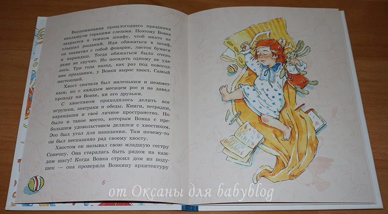 История совсем небольшая, ведь и книга невелика (маленький формат - примерно со школьную тетрадку, и всего 32 страницы текста со множеством картинок). Сюжет довольно незамысловат: мальчик Вовка обижается на свою младшую сестру Сонечку. Причем обижается просто потому, что она "хвостик".