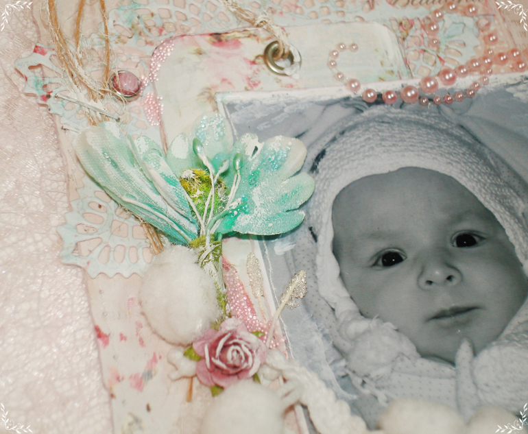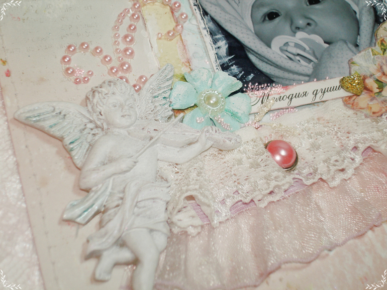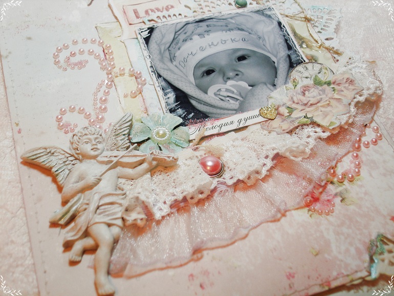 скрапмания!Третий разворотик по СП олучился немного музыкальный))) Ангелок играет "Мелодию Души", с боку подпевают птички... Сегодня мне захотелось микробисера ,розочек и совсем немного красок....часики покрыты кракле,птичек выделила глосси))) Обязательные элементы- символ любви и брадс!