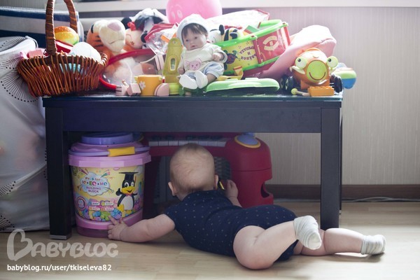 А еще этот уползун решил, что есть вещи поинтереснее, чем выделенные им погремушки. И активно пытается прибрать к рукам все, что не лежит на месте. Обычно это Варины игрушки. А в них много мелких деталей, это раз. И Варе совсем не нравится, что Тима на ее имущество посягает, это два. Варя нервничает, отбирает свои игрухи. Она конечно молодец, взамен практически всегда дает какую-нибудь Тимину зубочесалку. Но в последнее время это все реже прокатывает. Сынок как маленький, но очень вездеходный танк продолжает лезть к запретному, а я то и дело разворачиваю танк в обратном направлении. Ну, и Варе, собственно, приходится объяснять, что пора делиться, ну хоть чем то... делиться машинками, деффочка).