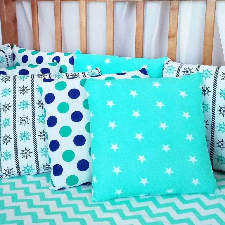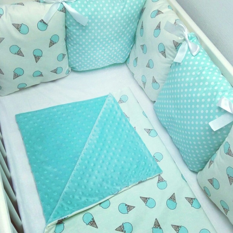 Бортики подушки 12 шт + простынь на резинке + одеяло двухстороннее + подушка с наволочкой и все это от 3500р ( Комплект подойдёт так же для круглых и овальных кроваток)!!!