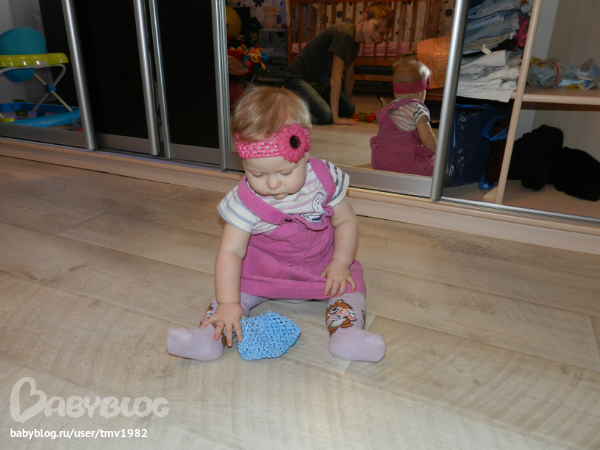 Играет в ладушки, скачет по кочкам и потом сама падает. Играет в прятки. Махает рукой "пока-пока". Ползает в коридор посмотреть кто там пришел. Ползает за мной как хвостик.