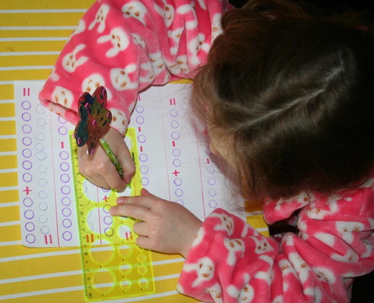 Хочется рассказать вам о незаменимом инструменте любой увлеченной мамы - трафарете с кругами различного диаметра. Это чудо просто идеально для самодельных математических заданий. Я еще не успела изучить весь его потенциал, но готова поделиться самими удачными придумками, которые обожает Камилка.